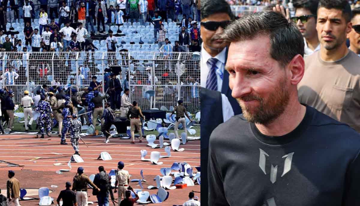 Lionel Messi’s tour of India got off to a chaotic start on Saturday as fans threw objects, tore chairs and invaded the pitch of Kolkata’s Salt Lake Stadium after the Argentine football great made only a brief appearance at a ticketed event.
