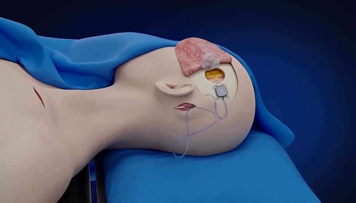 The electrodes are embedded in the brain, while the controller, battery, antenna and processor are located under the skin of the chest.